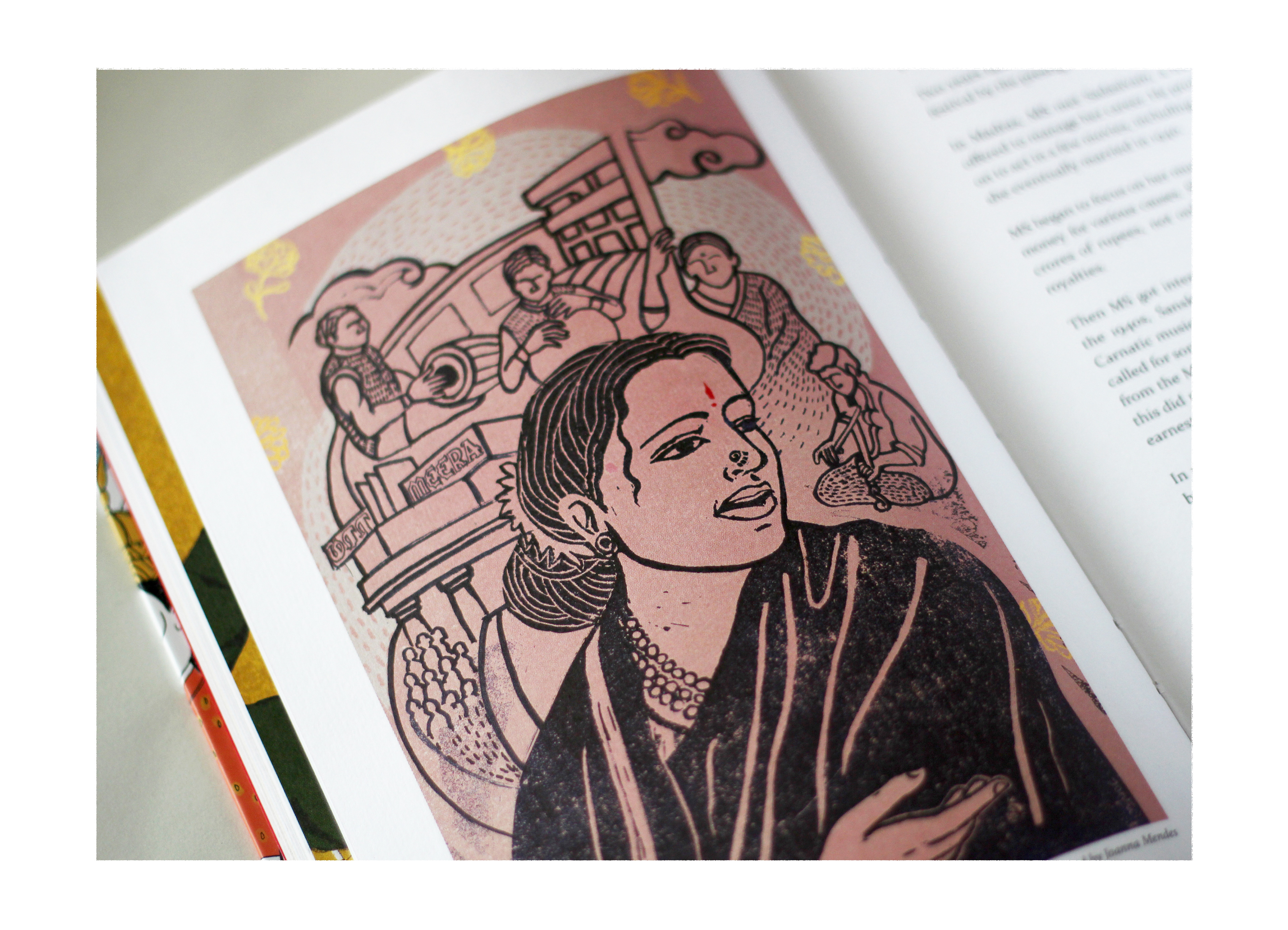The linosheet and test print used to create the illustrated portrait of M.S. Subbulakshmi