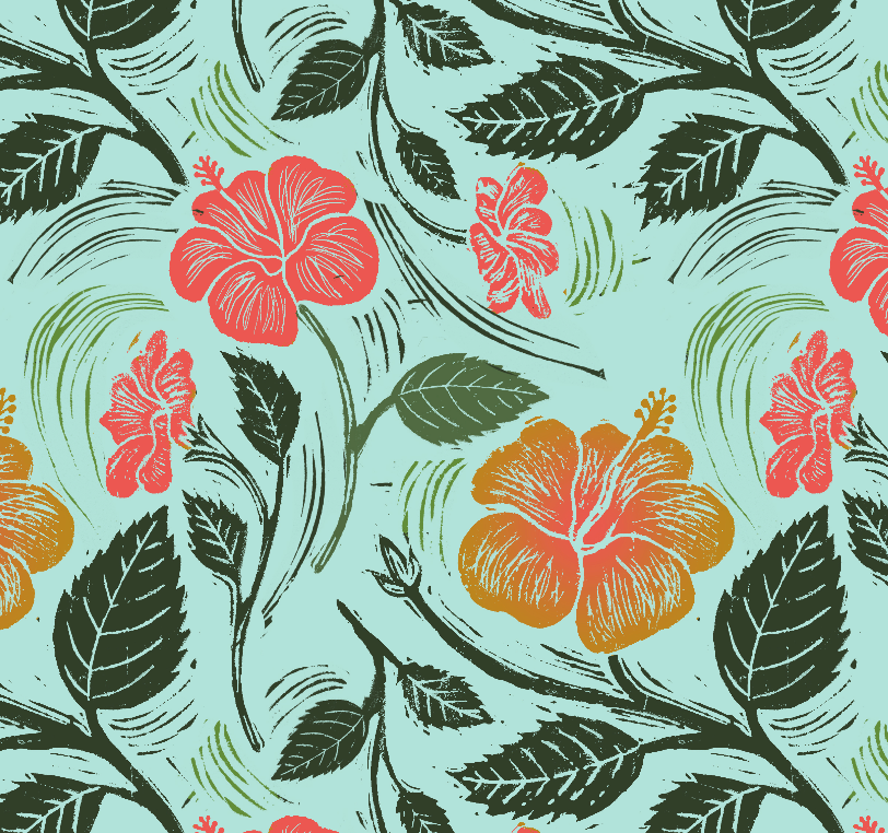 Surface Design for a Hawai Based Hotel. This pattern was rendered using digitally coloured linocut. This assignment was rendered at the Savannah College of Art and Design.